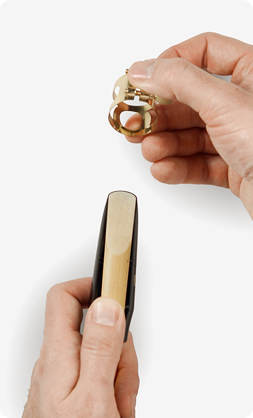 Наденьте лигатуру на мундштук. У лигатуры есть широкая и узкая части. Надевать на мундштук будем широкой частью так — винты будут располагаться со стороны трости.